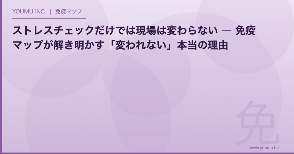 問題は、従来のストレスチェックやメンタルヘルス研修では、こうした「変化への免疫」を可視化できないことだ。表面的な症状を測定するだけでは、組織の深層にある変革阻害要因にアプローチできない。